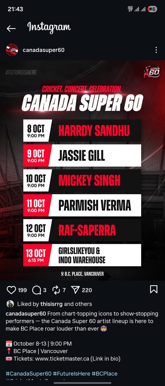 A spokesperson for Canada Super 60 shared, “This is not just cricket; this is a lifestyle experience. Our entertainment line-up reflects the league’s ambition — to create a festival that unites cultures through music, sport, and community.”